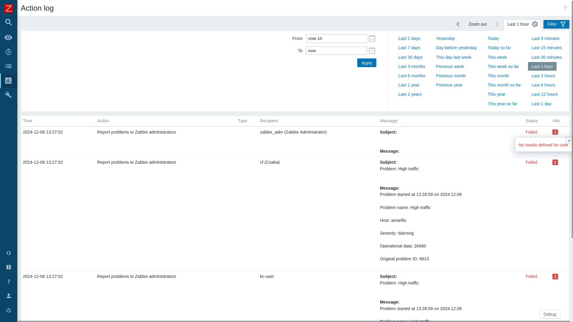 In Reports > Action log i saw the alert was failing: